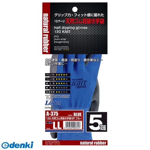 おたふく手袋 13G 天然ゴム背抜き手袋 5双組 LL ブルー 2111015A-375 ライトシリーズ A-375 | |
