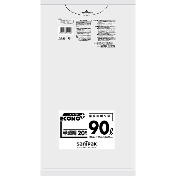 {3ケース以上特別価格(事業者限定)}E-99 サニパック エコノプラス 90L 半透明 20枚×15冊 | |