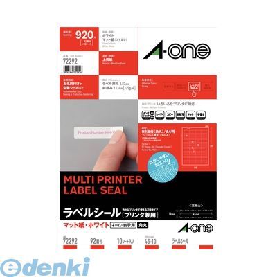 (LINEクーポン有)翌日出荷 A-one エーワン 72292 ラベルシール プリンタ兼用 A4 92面 四辺余白付角丸 10シート入 4906186722926 マット紙 スリーエム | |