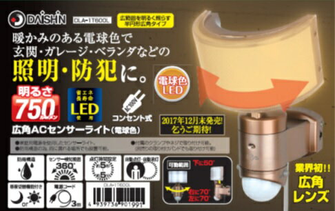 LED広角ACセンサーライト(電球色) 超広範囲タイプ DLA-1T600L (4939736901991) 防犯 セキュリティー 照明 【送料無料・北海道沖縄離島を除く(送料別途お見積りとなります)】エコ | |