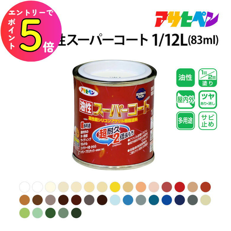 [エントリーでP+5倍] アサヒペン 油性スーパーコート 1/12L(83ml) 全45色 カラー1 油性塗料 ASAHIPEN | ペンキ 塗料 diy ペイント 油性 リノベーション 塗装用品 壁 リメイク 耐水 塗る 屋内 屋外 リフォーム 木材 鉄 コンクリート 塗装 フェンス 外壁 保護 さび止め | |